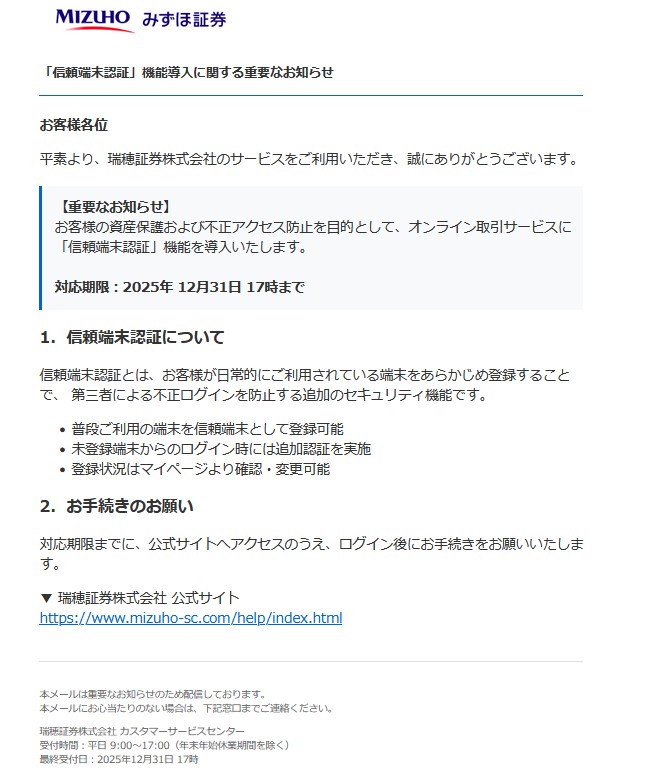 『平素より、瑞穂証券株式会社のサービスをご利用いただき、誠にありがとうございます。』