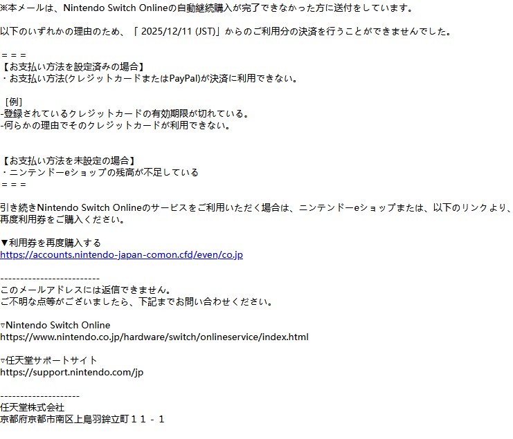 『※本メールは、Nintendo Switch Onlineの自動継続購入が完了できなかった方に送付をしております。』