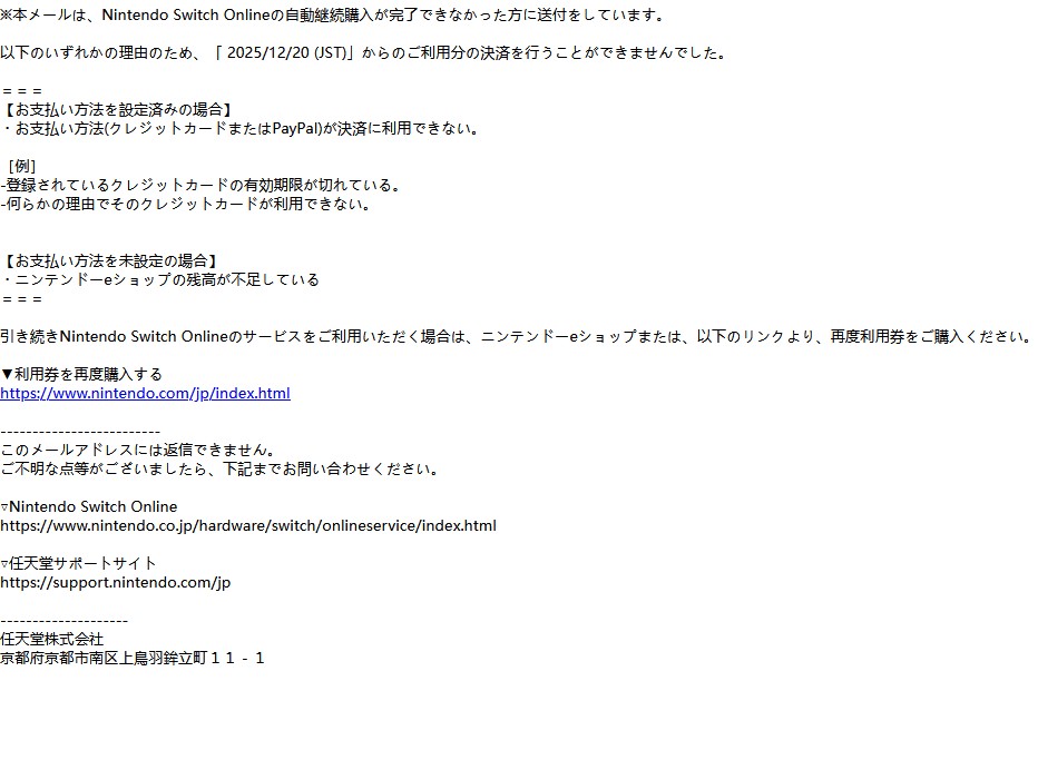 『※本メールは、Nintendo Switch Onlineの自動継続購入が完了できなかった方に送付をしております。』