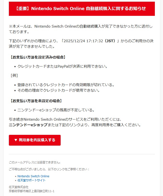 『※本メールは、Nintendo Switch Onlineの自動継続購入が完了できなかった方に送付をしております。』