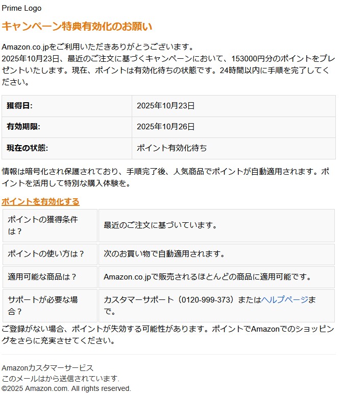「2025年10月23日、最近のご注文に基づくキャンペーンにおいて、153000円分のポイントをプレゼントいたします。」