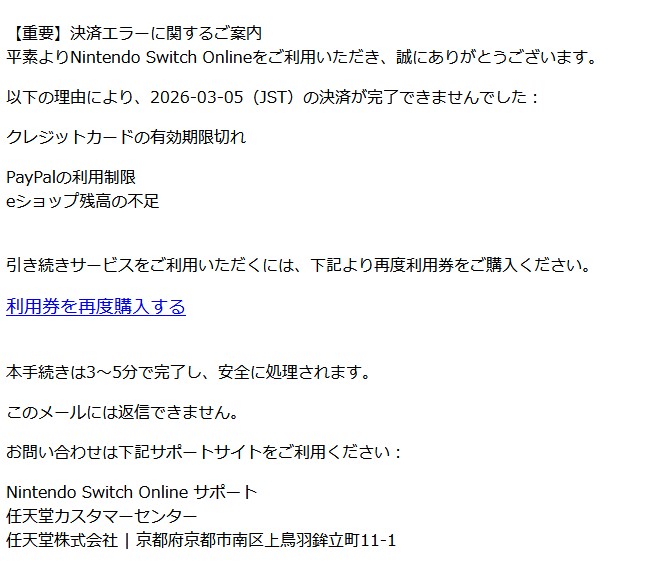 『平素よりNintendo Switch Onlineをご利用いただき、誠にありがとうございます。』