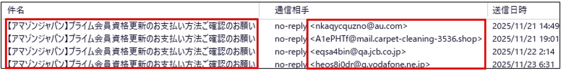 件名は全て「【アマゾンジャパン】プライム会員資格更新のお支払い方法ご確認のお願い」になっています。