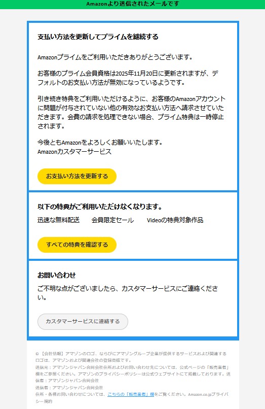 お客様のプライム会員資格は2025年11月20日に更新されますが、デフォルトのお支払い方法が無効になっているようです。」
