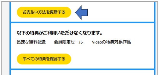 「引き続き特典をご利用いただけるように、お客様のAmazonアカウントに問題が付与されていない他の有効なお支払い方法へ請求させていただきます。会費の請求を処理できない場合、プライム特典は一時停止されます。」