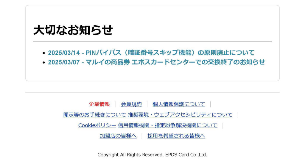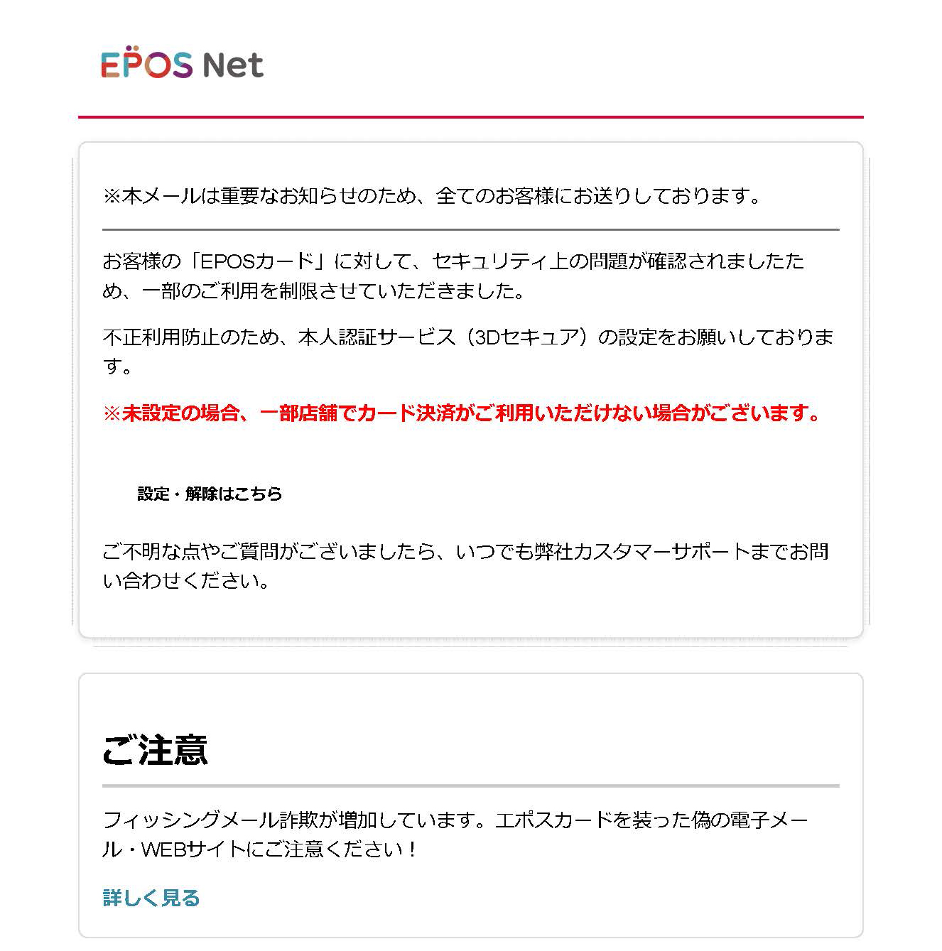 お客様の「EPOSカード」に対して、セキュリティ上の問題が確認されましたため、一部のご利用を制限させていただきました。
