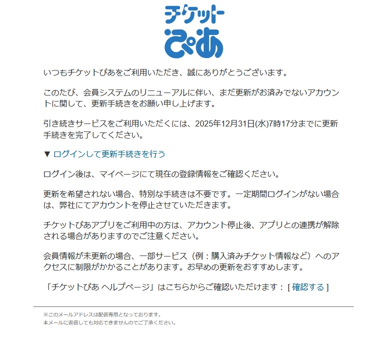 『このたび、会員システムのリニューアルに伴い、まだ更新がお済みでないアカウントに関して、更新手続きをお願い申し上げます。』