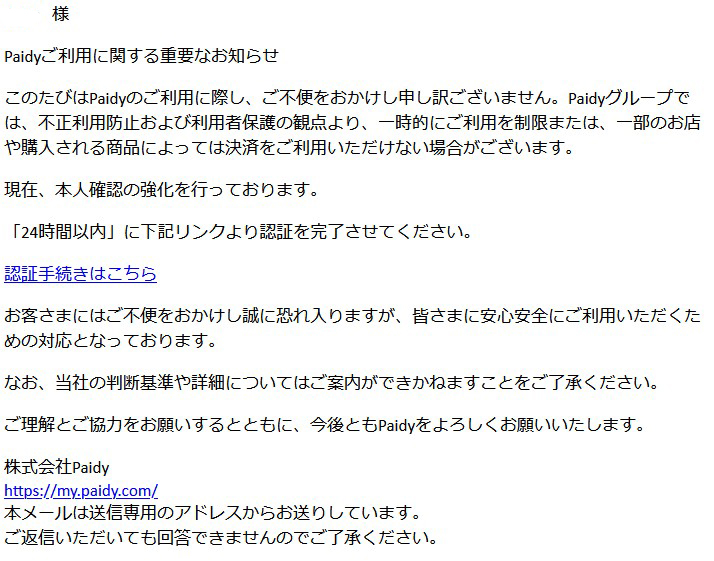 「このたびはPaidyのご利用に際し、ご不便をおかけし申し訳ございません。Paidyグループでは、不正利用防止および利用者保護の観点より、 一時的にご利用を制限または、一部のお店や購入される商品によっては決済をご利用いただけない場合がございます。」