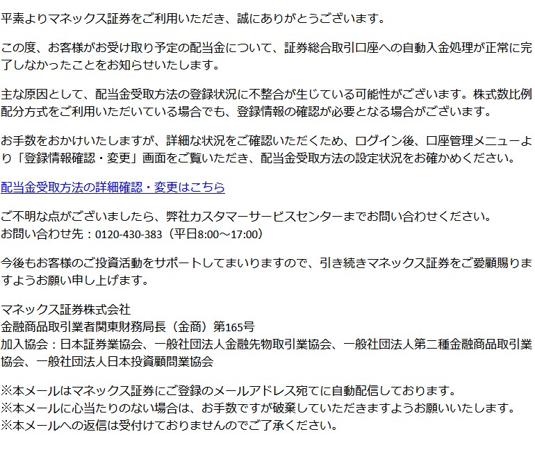 『この度、お客様がお受け取り予定の配当金について、証券総合取引口座への自動入金処理が正常に完了しなかったことをお知らせいたします。』