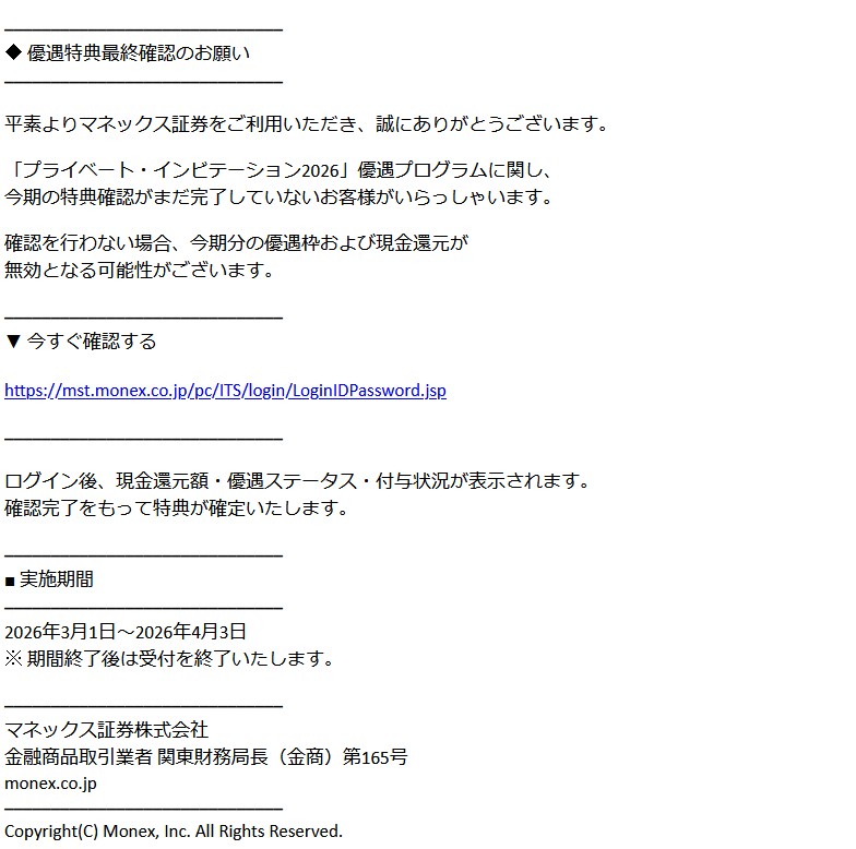 確認を行わない場合、今期分の優遇枠および現金還元が無効となる可能性がございます。』