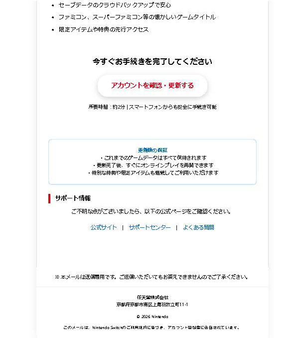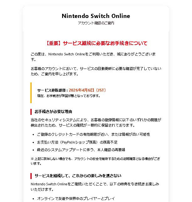 『この度は、Nintendo Switch Onlineをご利用いただき、誠にありがとうございます。