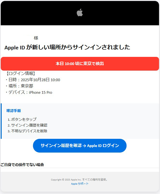 「Apple ID が新しい場所からサインインされました」