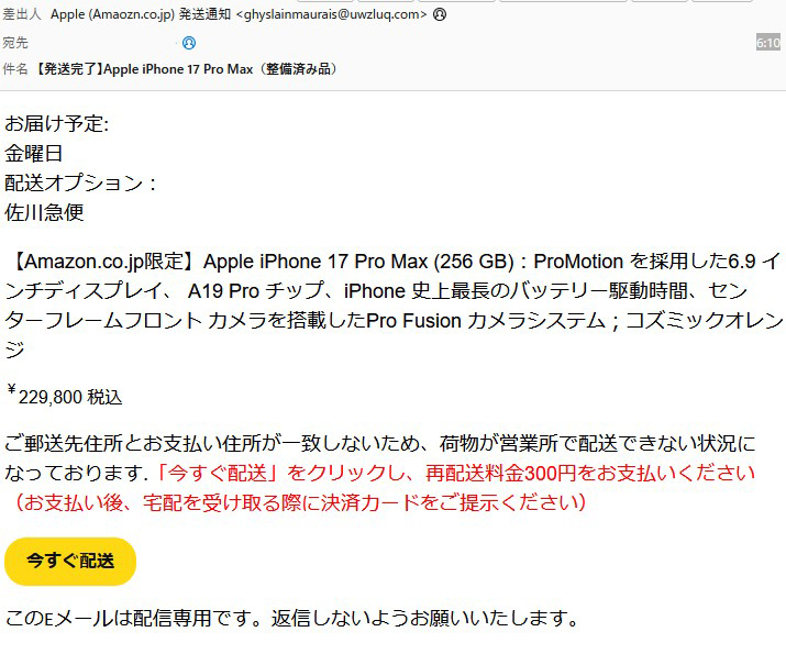 「ご郵送先住所とお支払い住所が一致しないため、荷物が営業所で配送できない状況になっております.「今すぐ配送」をクリックし、再配送料金300円をお支払いください(お支払い後、宅配を受け取る際に決済カードをご提示ください)」