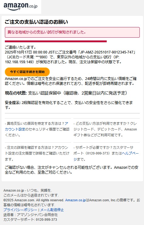2025年10月17日 00:00:00 JSTにご注文番号「JP-AMZ-20251017-9012345-747」(JCBカード末尾: ***890)で、東京以外の地域からの支払い試行(IP: 192.168.159.149)が検知されました。現在、注文は保留中の状態です。」