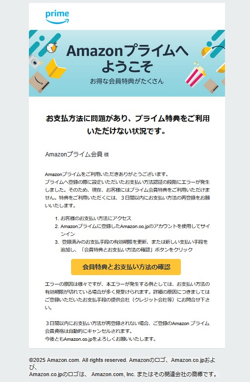 「現在、お客様にはプライム会員特典をご利用いただけません。特典をご利用いただくには、 3日間以内にお支払い方法の再登録をお願いいたします。」