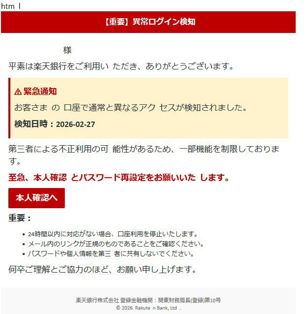 「お客さま の口座で通常と異なるアクセスが検知されました。」