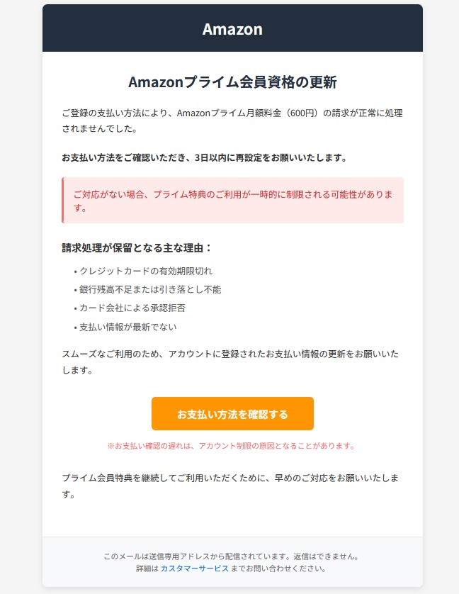 『ご登録の支払い方法により、Amazonプライム月額料金(600円)の請求が正常に処理されませんでした。』