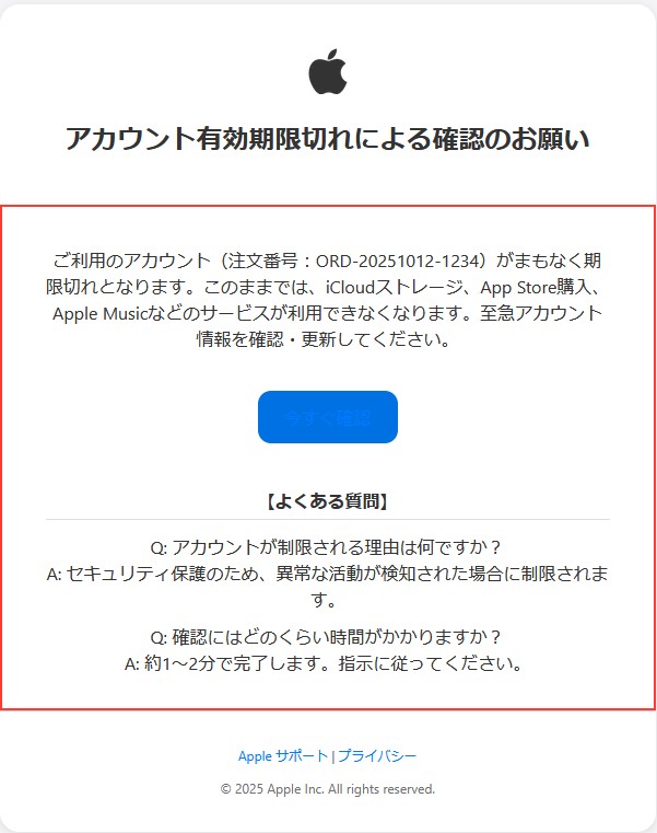 「ご利用のアカウント(注文番号:ORD-20251012-1234)がまもなく期限切れとなります。このままでは、iCloudストレージ、App Store購入、Apple Musicなどのサービスが利用できなくなります。至急アカウント情報を確認・更新してください。」