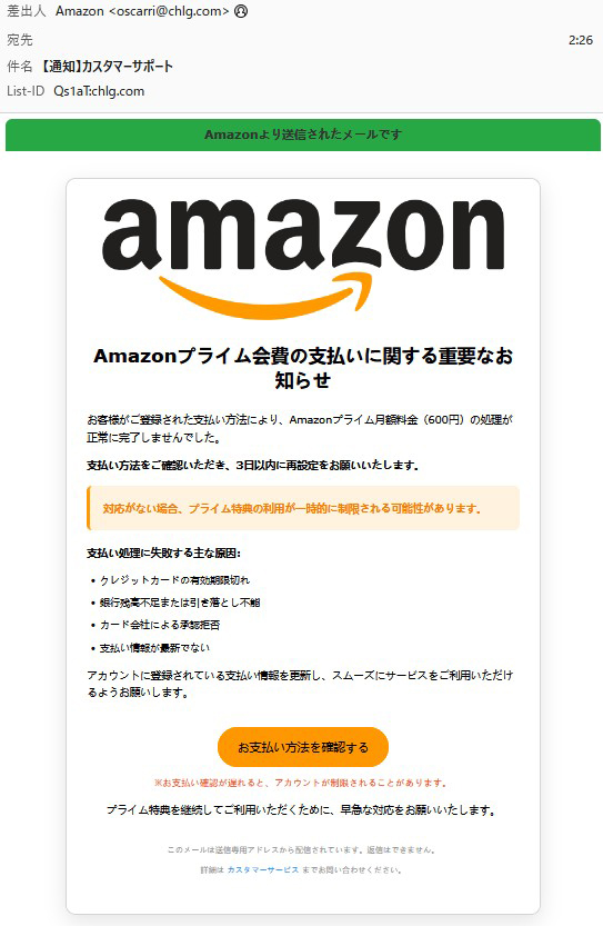 『お客様がご登録された支払い方法により、Amazonプライム月額料金(600円)の処理が正常に完了しませんでした。』