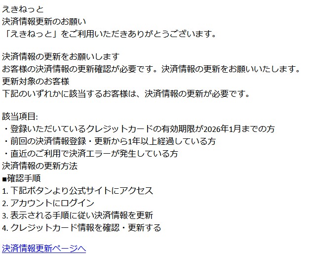 今回は”えきねっと”を騙る詐欺メールです。