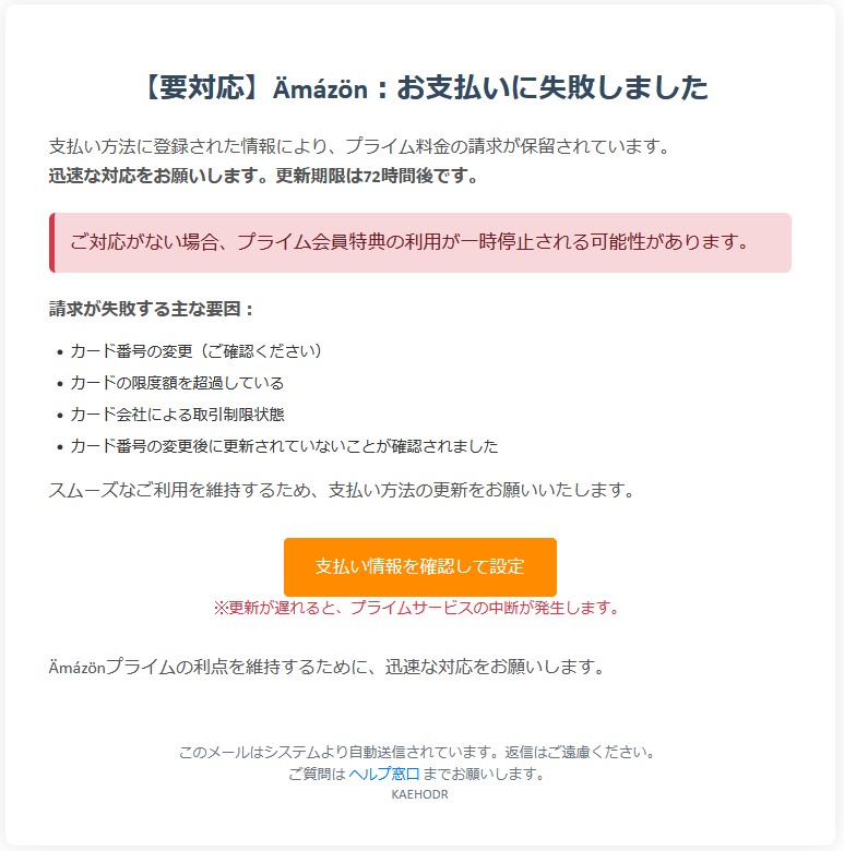 「ご対応がない場合、プライム会員特典の利用が一時停止される可能性があります。」