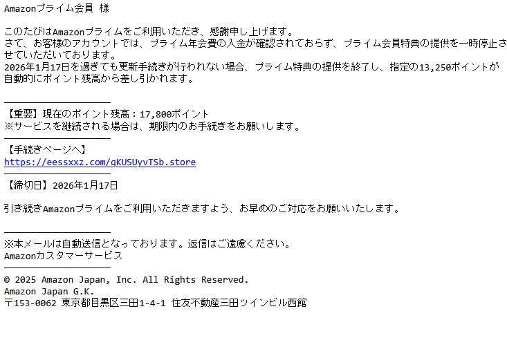 「2026年1月17日を過ぎても更新手続きが行われない場合、プライム特典の提供を終了し、指定の13,250ポイントが自動的にポイント残高から差し引かれます。」