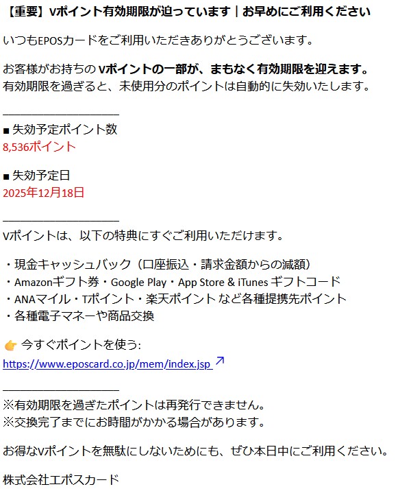 『お客様がお持ちの Vポイントの一部が、まもなく有効期限を迎えます。