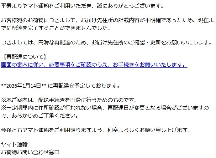 つきましては、円滑な再配達のため、お届け先住所のご確認・更新をお願いいたします。