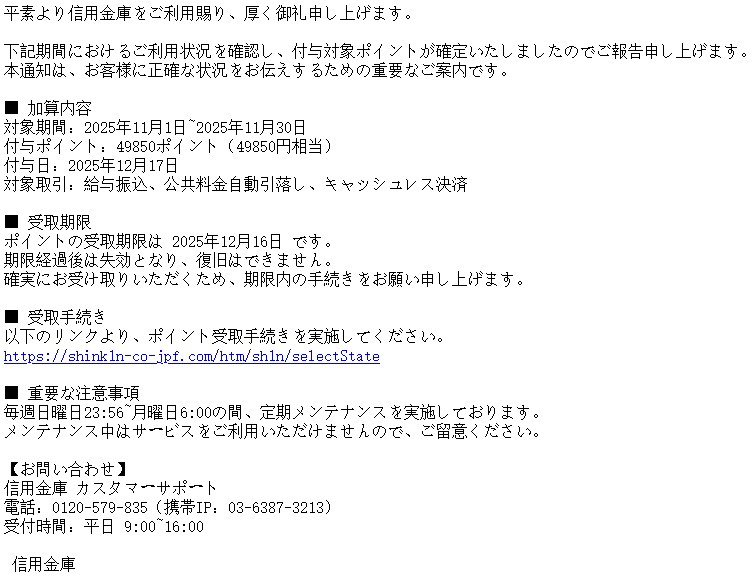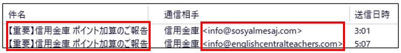 件名は全て「【重要】信用金庫 ポイント加算のご報告」になっています。
