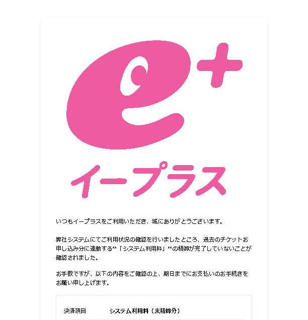 弊​社シス​テムに​てご利​用状​況の確​認を行​いまし​たところ、過​去のチ​ケットお​申し込​み分に連​動する「シス​テム利​用料」の精​算が完​了して​いない​ことが確​認さ​れました。