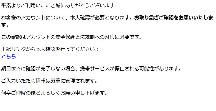 「期日までに確認が完了しない場合、携帯サービスが停止される可能性があります。」