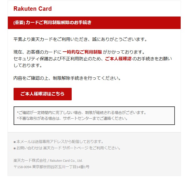 「現在、お客様のカードに 一時的なご利用制限 がかかっております。」