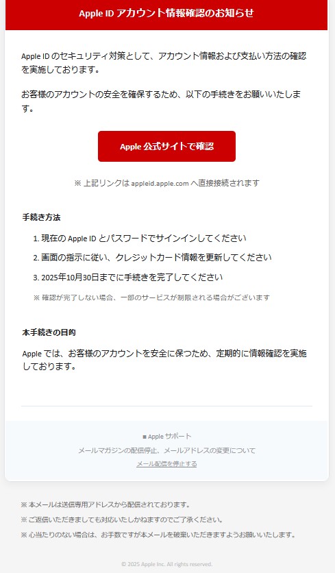 「Apple ID のセキュリティ対策として、アカウント情報および支払い方法の確認を実施しております。。」