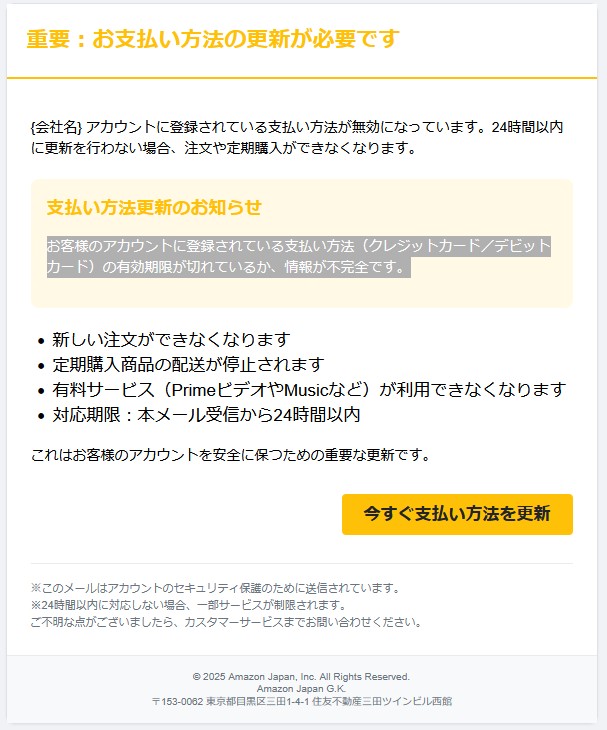 『{会社名} アカウントに登録されている支払い方法が無効になっています。24時間以内に更新を行わない場合、注文や定期購入ができなくなります。』