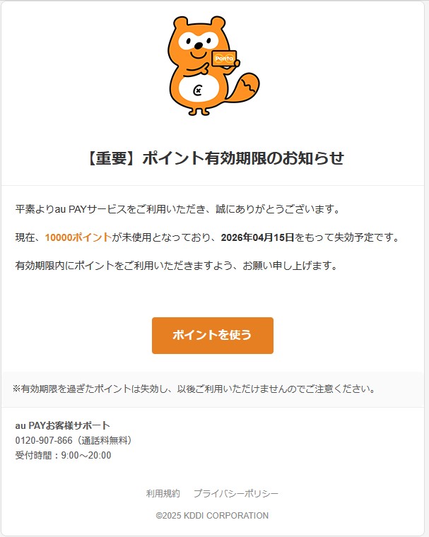 『現在、10000ポイントが未使用となっており、2026年04月15日をもって失効予定です。』