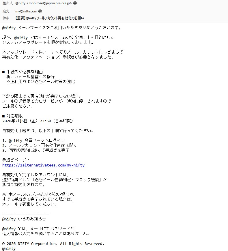 今回は”nifty”を騙る詐欺メールです。