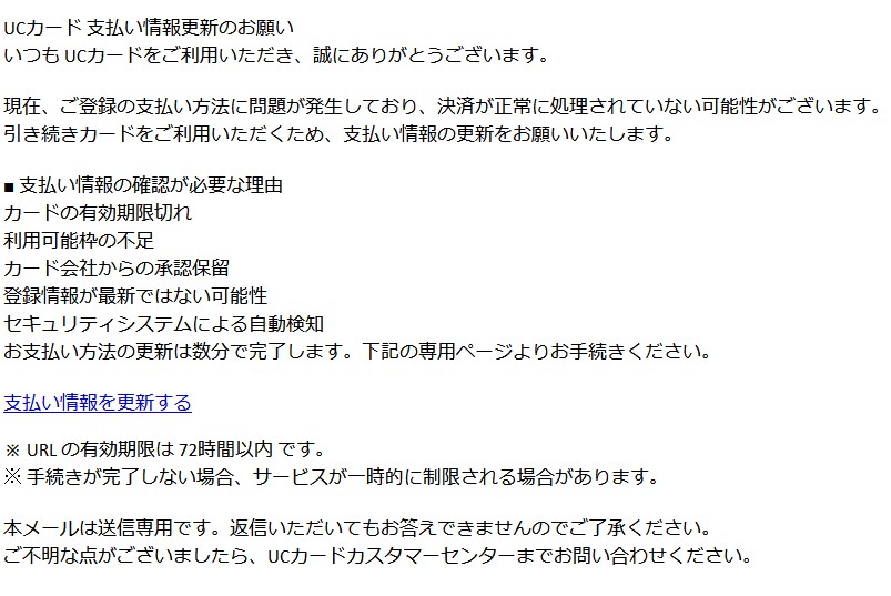 『現在、ご登録の支払い方法に問題が発生しており、決済が正常に処理されていない可能性がございます。』