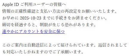 今回は”アップル(Apple)”を語る詐欺メールです。