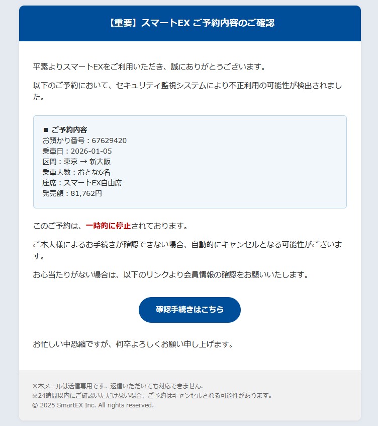 今回は”スマートEX”を語る詐欺メールです。
