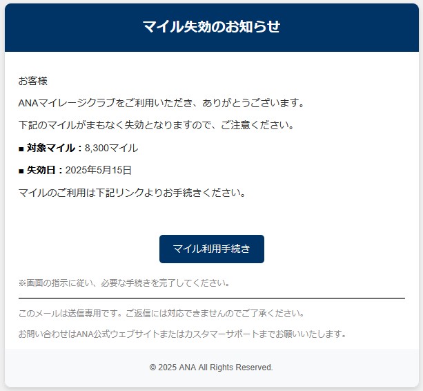 『下記のマイルがまもなく失効となりますので、ご注意ください。