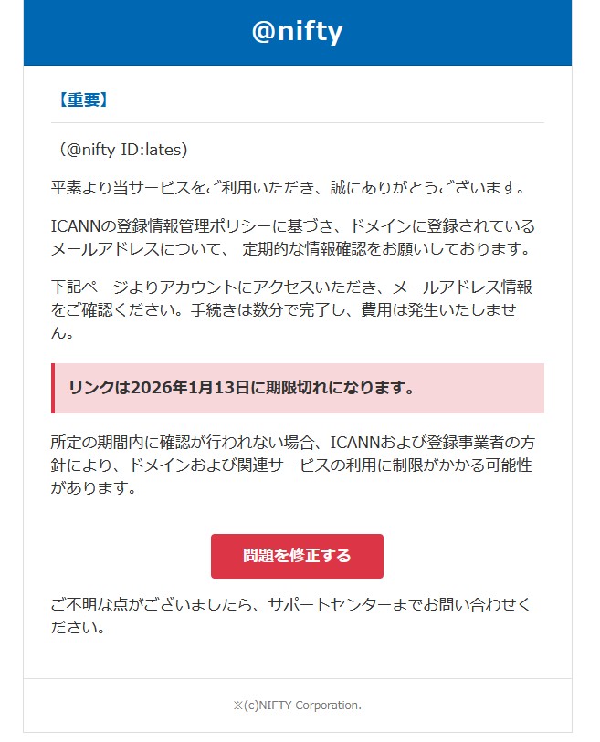今回は”nifty”を騙る詐欺メールです。