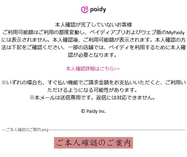ご利用可能額はご利用の都度変動し、ペイディアプリおよびウェブ版のMyPaidyには表示されません。本人確認後、ご利用可能額が表示されます。本人確認の方法は下記をご確認ください、一部の店舗では、ペイディを利用するために本人確認が必要となります。』
