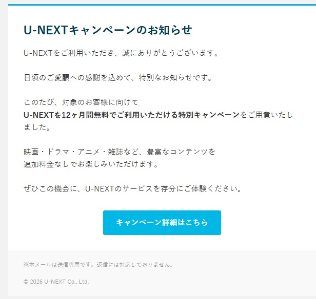 『U-NEXTを12ヶ月間無料でご利用いただける特別キャンペーンをご用意いたしました。』