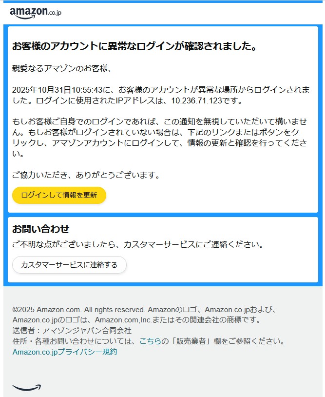 「2025年10月31日10:55:43に、お客様のアカウントが異常な場所からログインされました。ログインに使用されたIPアドレスは、10.236.71.123です。」