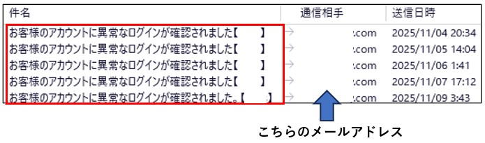 件名は全て「お客様のアカウントに異常なログインが確認されました【私の通称】」になっています。