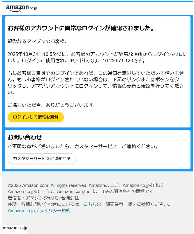 「2025年10月31日10:55:43に、お客様のアカウントが異常な場所からログインされました。ログインに使用されたIPアドレスは、10.236.71.123です。」