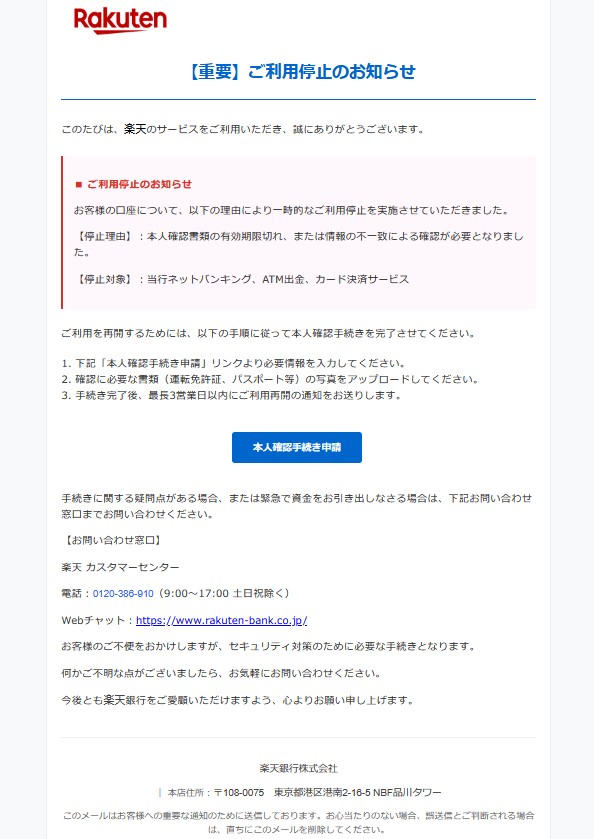 『【停止理由】:本人確認書類の有効期限切れ、または情報の不一致による確認が必要となりました。
