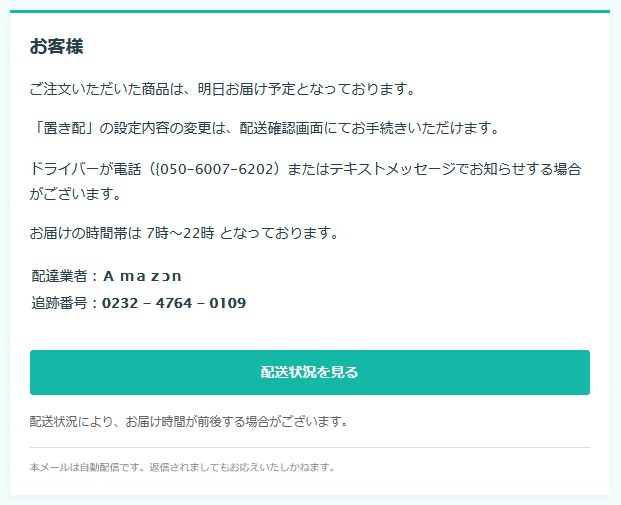 『ドライバーが電話({050-6007-6202)またはテキストメッセージでお知らせする場合がございます。』