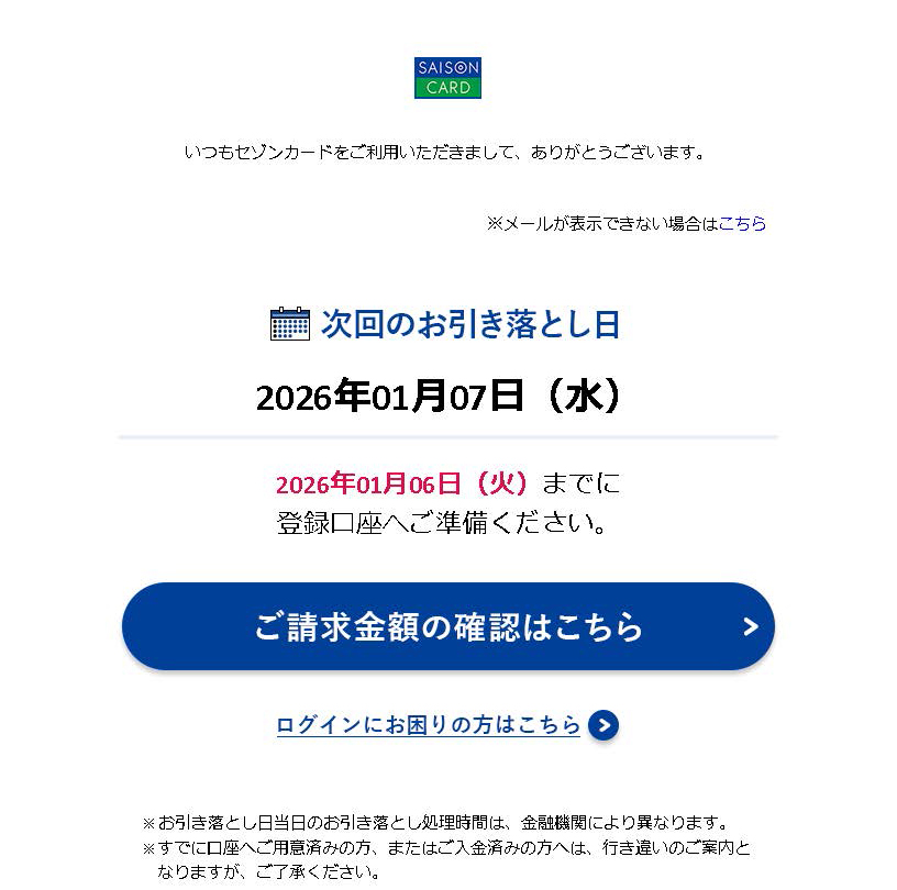 『次回のお引き落とし日 2026年01月07日(水)』