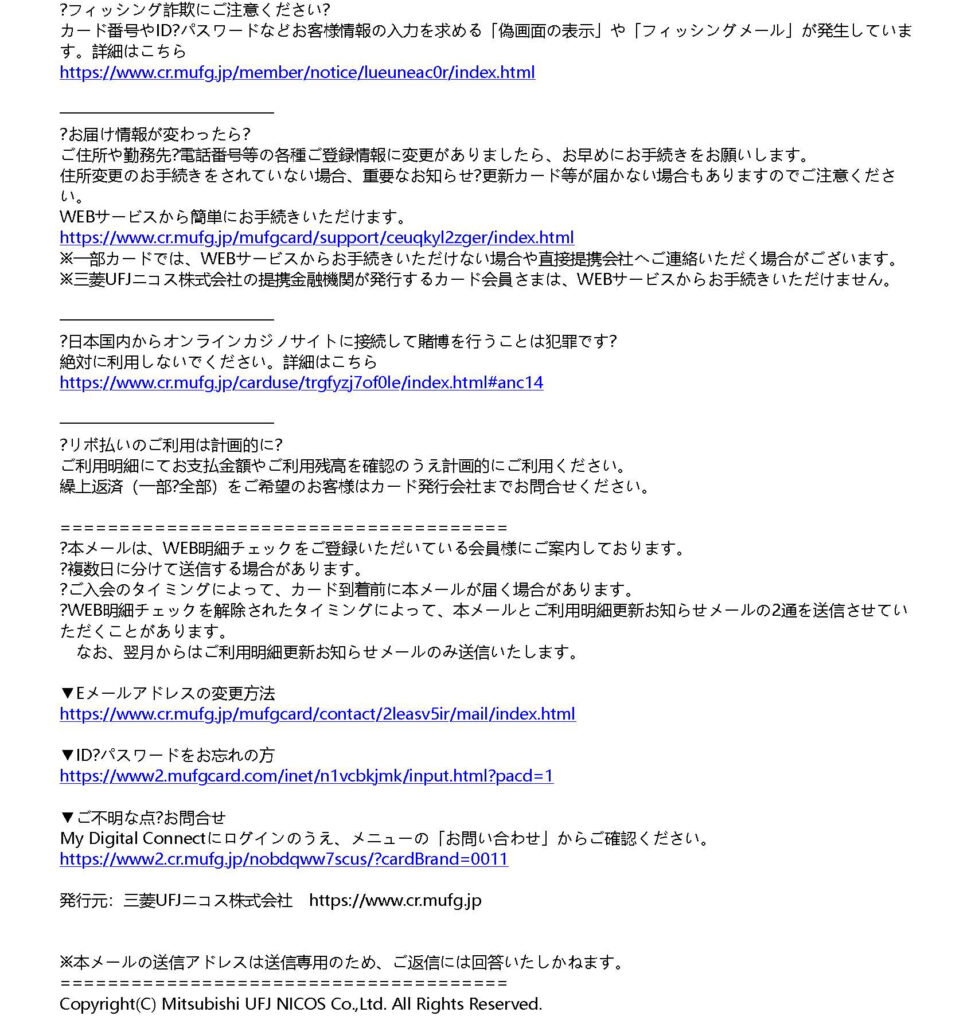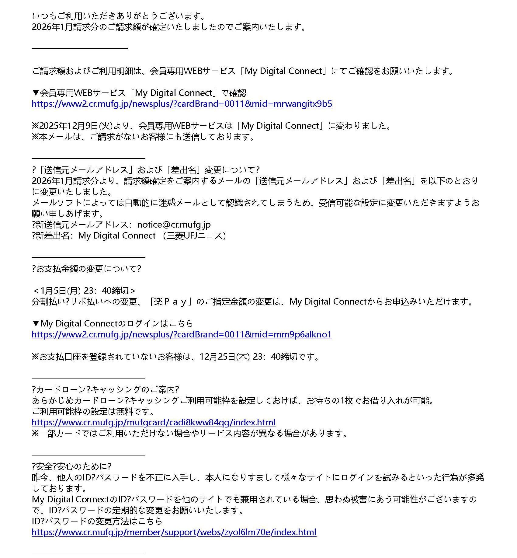 今回は”三菱UFJカード”を騙る詐欺メールです。
